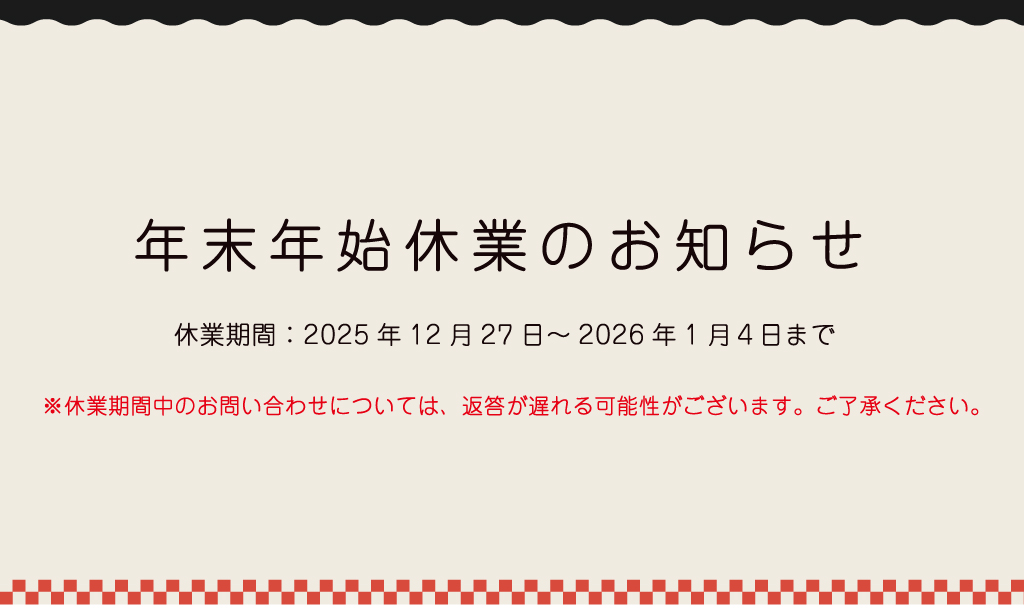 休業期間中にいただいたお問い合わせにつきましては、2025年1月5日(月)より順次対応させていただきます。