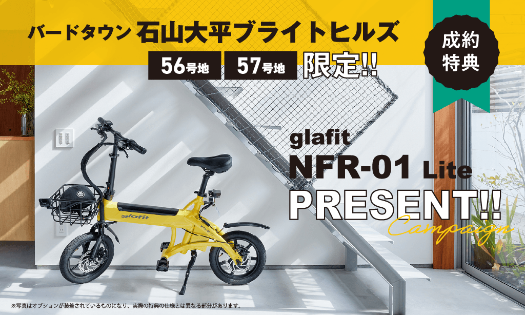 期間中、対象区画をご成約いただいたお客様に、こがずにスイスイ進む電動サイクル**「glafit NFR-01 Lite」**をプレゼントいたします 。